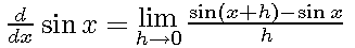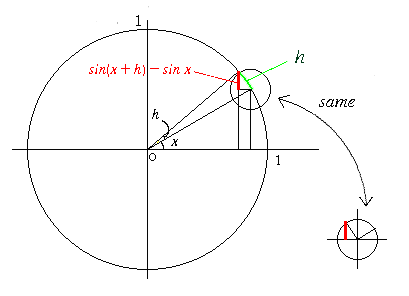 The applet and the left side figure show The large circle is the unit circle. The red line segment has the length sin(x+h)-sin x. Observe the change of the red segment using the applet and consider what is the relation between the angle x and the length of the red segment.